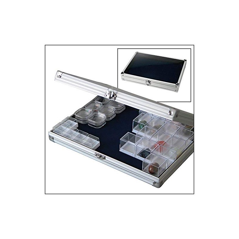 • Mit dunkelblauem Velours ausgekleidet. Alu-Vitrine mit metallverstärkten Ecken und Kanten.