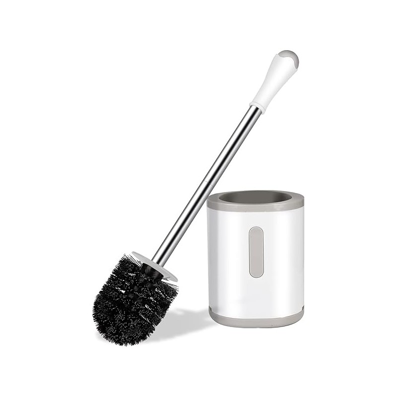 Compact Toilet Brush & Holder, Stainless Steel Handle, Space Saving for Storage, Deep Cleaning, Drip-Proof, Easy to Assemble, Nylon Bristles, White & Grey