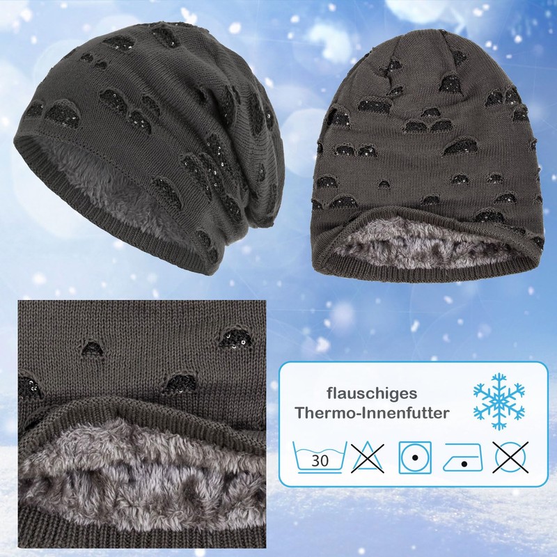 Beautiful one-size winter beanie. Soft, warm and fine fabric make it super comfortable to wear. Cuddly soft fleece fur lining for warm heads. One size: Length: approx. 28 cm, Circumference: approx. 52 cm (flexible). Perfect for wearing directly on the scalp. Material composition: 100% acrylic; lining 100% polyester.