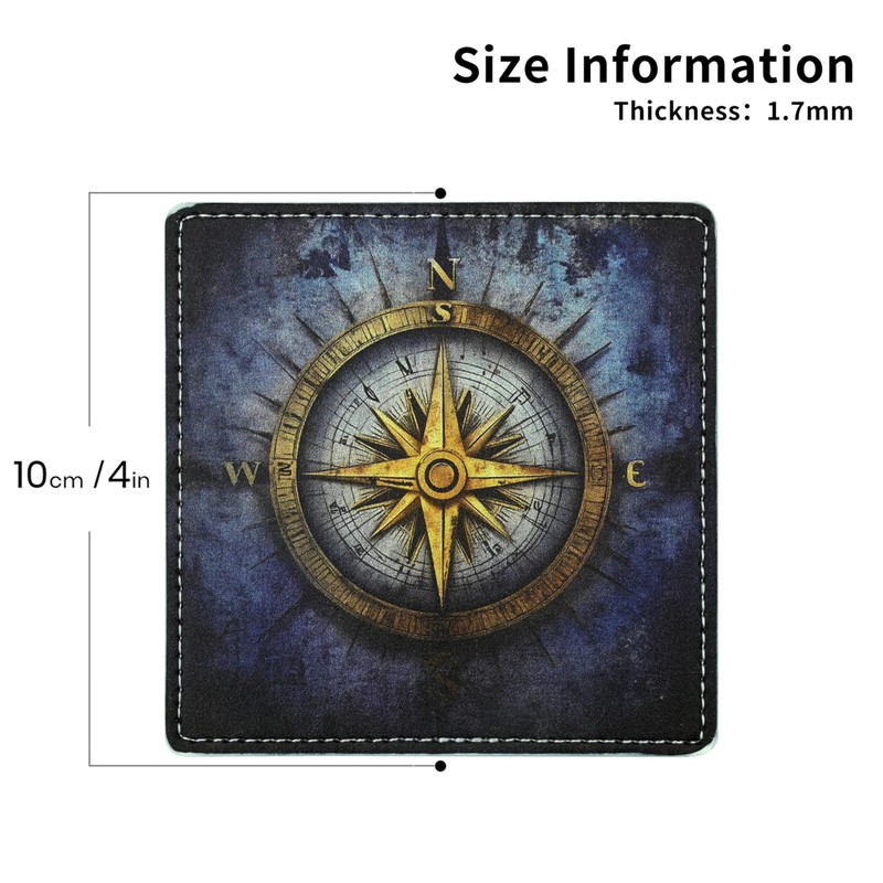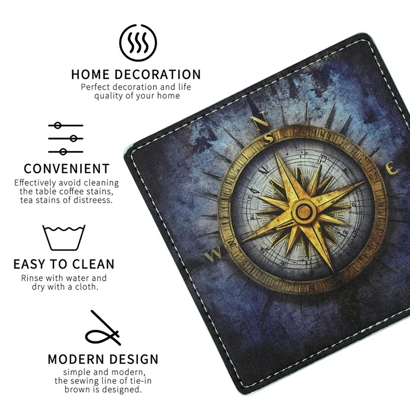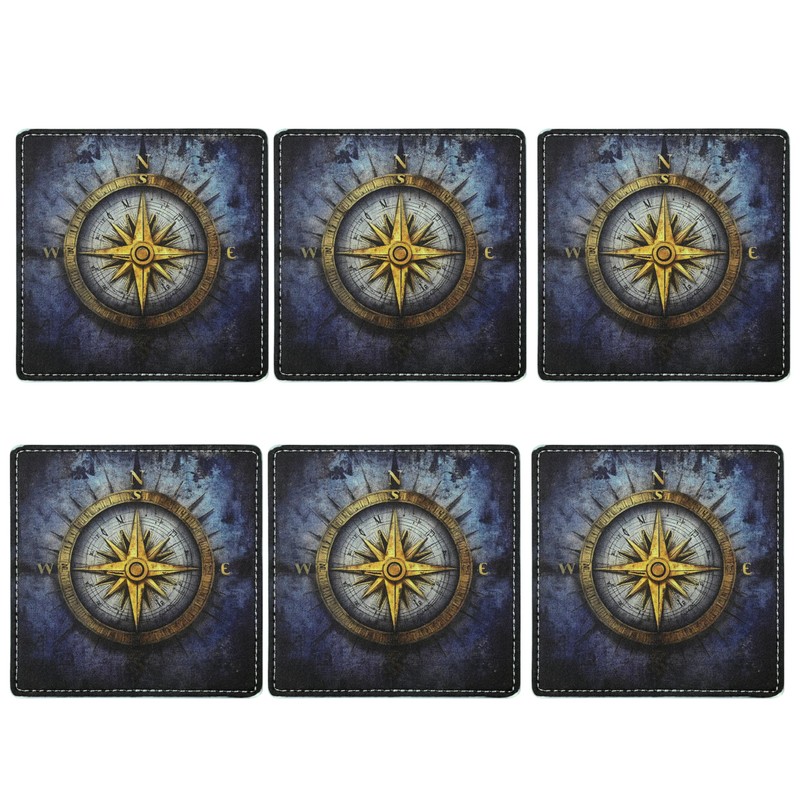 Compass Rose Coasters Square Leather Drinks Coaster Set with Holder for Coffee Table Bar Home Decor 4 Inches Set of 6