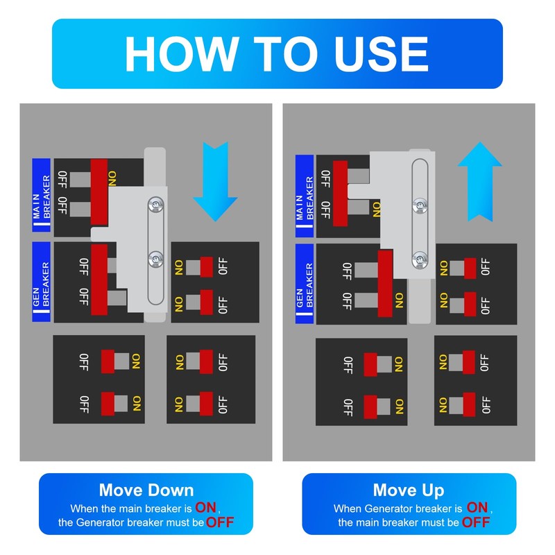 - EASY TO INSTALL: The generator interlock kit is easy to install on the panel without additional tools and wiring. Simulate the position of the generator interlock kit before installation to avoid incorrect drilling position.
