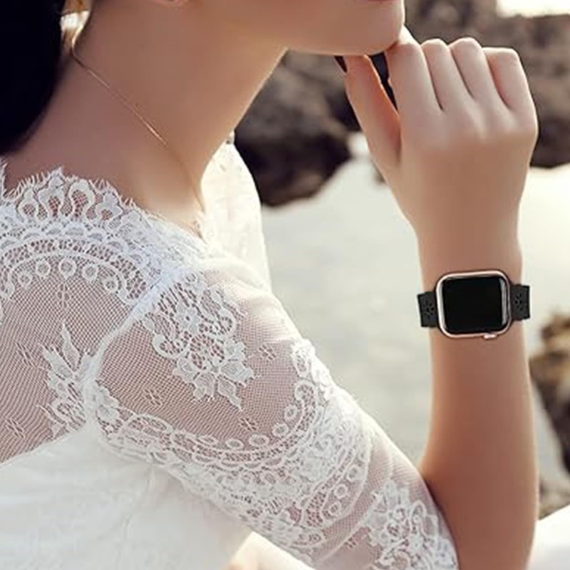 - 【Silicone Material】The slim lace watch bands is made of premium soft Lace Silicone and stainless steel classic buckle, which can prevent skin irritation and has a breathable and comfortable texture. The apple watch strap is durable, waterproof, dirt-proof, lightweight and skin-friendly.