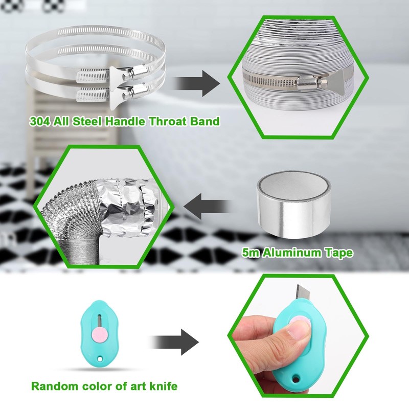 - Easy installation: our flexible aluminium tube is equipped with 2 hose clamps. The tightness can be adjusted according to actual conditions. The exhaust pipe can be easily attached firmly to the connection for better sealing. When using, insert the air outlet into this aluminium exhaust hose. When installing the hose, it must be tightened with a pipe clamp.