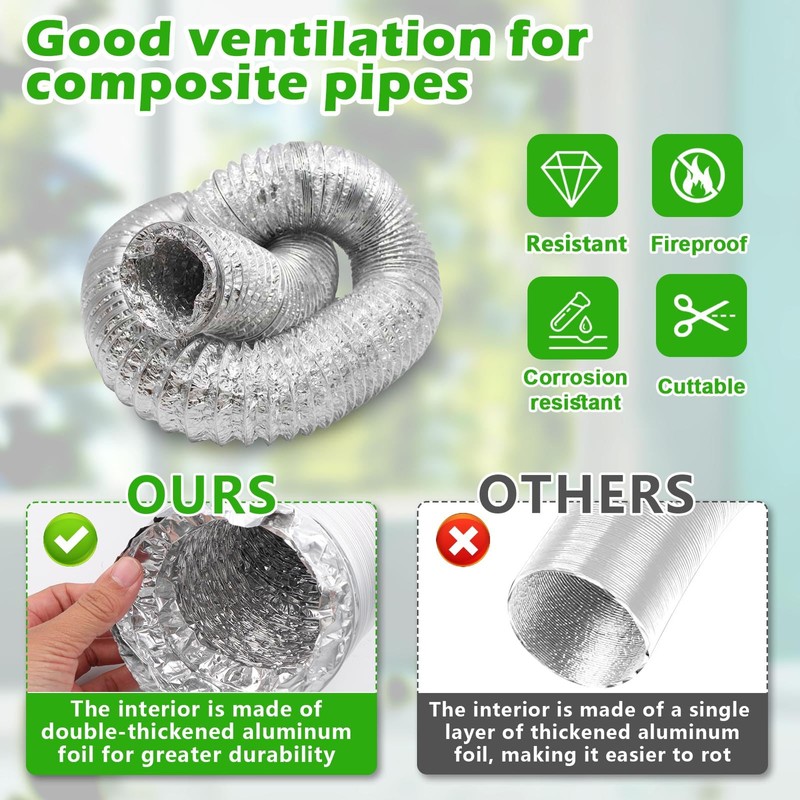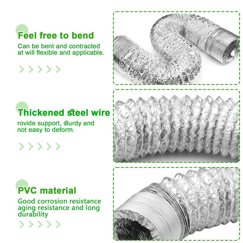 - Material: The material of the flexible aluminium tube is high-quality 304 stainless steel, which is robust and durable. It feels good, stretchy and has strong elasticity. The ventilation duct is made of high-quality aluminium foil and PVC, flame retardant coating, built-in steel wire reinforcement, with durable strength and performance, corrosion resistance and can be used for a long time.