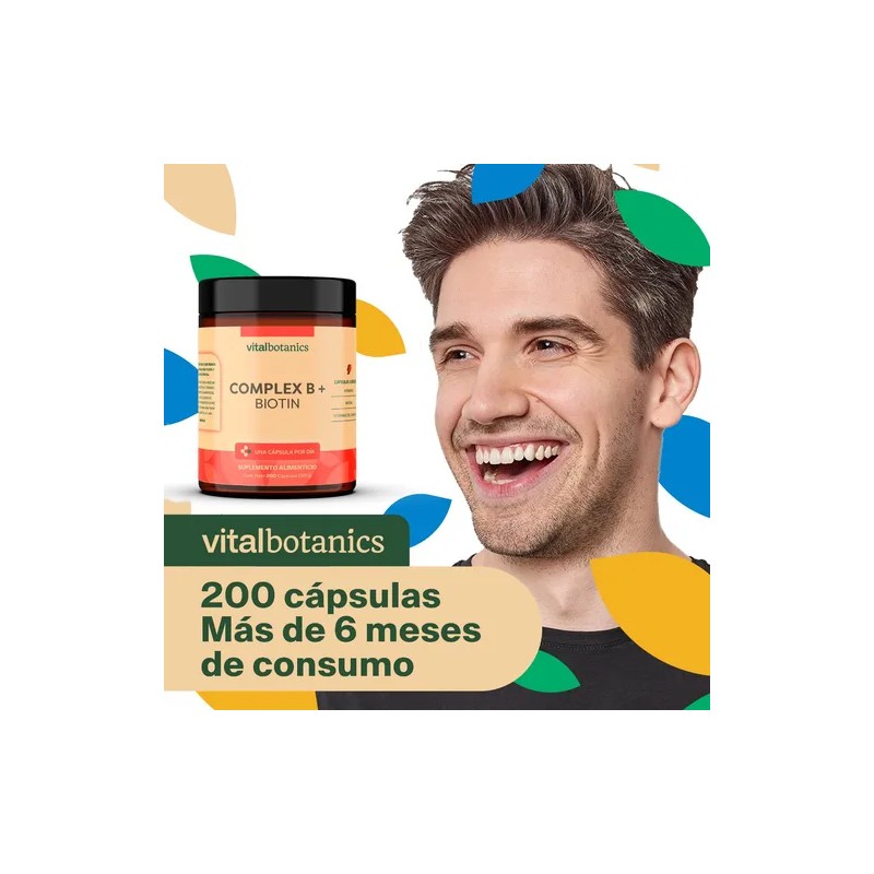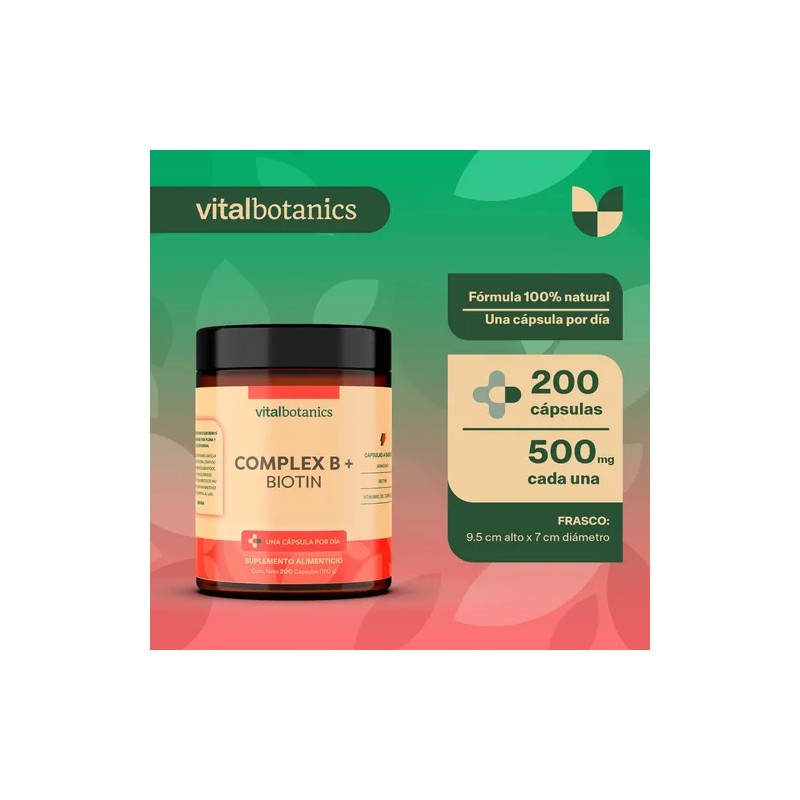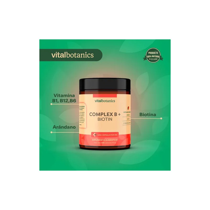 Complejo B + Biotina | VitalBotanics | 200 Cápsulas de 500mg | Vitaminas B1, B2, B3, B5, B6, B12 y Arándano