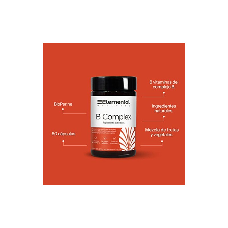 Acerca de este artículo TODAS LAS VITAMINAS DEL COMPLEJO B: Combinamos las vitamina b B1, B2, B3, B5, B6, B7, B9 y vitamina B12 proporcionando un soporte integral para el metabolismo energético, la salud del sistema nervioso y la función cognitiva. BIOPERINA: Enriquecido con BioPerine, un extracto patentado de pimienta negra, que mejora la biodisponibilidad de los nutrientes para una absorción óptima. BioPerine es el único producto de piperina respaldado por estudios científicos que garantizan su eficacia y seguridad. Es la única fuente de pimienta negra que ha sido sometida a estudios clínicos en los Estados Unidos, corroborando su seguridad y eficacia para uso nutricional. MEZCLA DE FRUTAS Y VERDURAS: Este complejo B para mujeres y hombres contiene una mezcla de frutas y verduras, proporcionan compuestos importantes como vitaminas, minerales, antioxidantes y fibra de frutas y verduras como limón, guayaba, manzana, arándano rojo, frambuesa, fresa, jitomate, albahaca, espinaca, zanahoria, betabel, brócoli y uva. CÓMO USARLO: Solo toma una cápsula diaria para obtener todos los beneficios de nuestro complejo vitamínico B. Cada frasco contiene 60 cápsulas veganas, suficientes para un suministro de 2 meses, haciendo que sea una excelente adición a tu rutina diaria. SUPLEMENTO ALIMENTICIO DE CALIDAD: El Complejo B Elemental es 100% libre de gluten y alérgenos, sin aditivos artificiales, sin azúcares añadidos, sin sabores ni edulcorantes. Apto para veganos, formulado para ofrecerte lo mejor en suplementación nutricional.