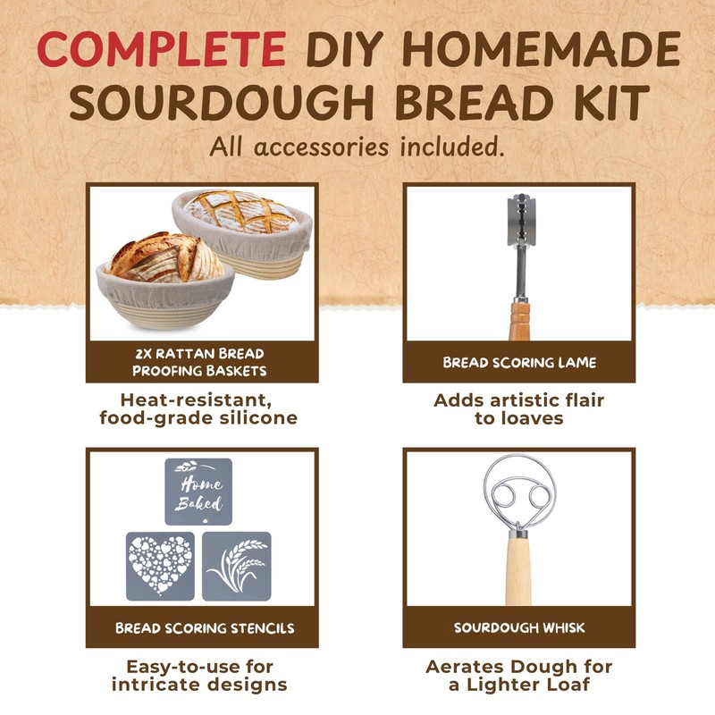 - Complete Sourdough Kit- The only kit that includes a Sourdough Starter Container, two Bread Proofing Bowls, & more to make delicious and nutritious homemade sourdough bread; for beginners and professionals alike. Printed Recipe Book Included.