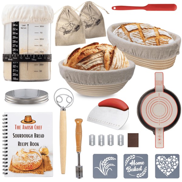 - Includes: Glass Jar for Sourdough Starter with tracking band and temperature strip, two Silicone Sourdough Proofing Baskets, Recipe Book, Danish Whisk, Bread Scoring Lame & Scoring Stencils, Dough Slicer & More!