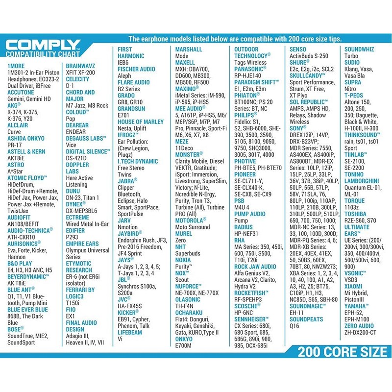• Compatibility - 200-series fits Bose, Jays, Sony, RHA, Philips, Ultimate Ears and more; multiple core sizes allow you to find the ideal fit for your earphones; find your compatibility at manufacturer's website