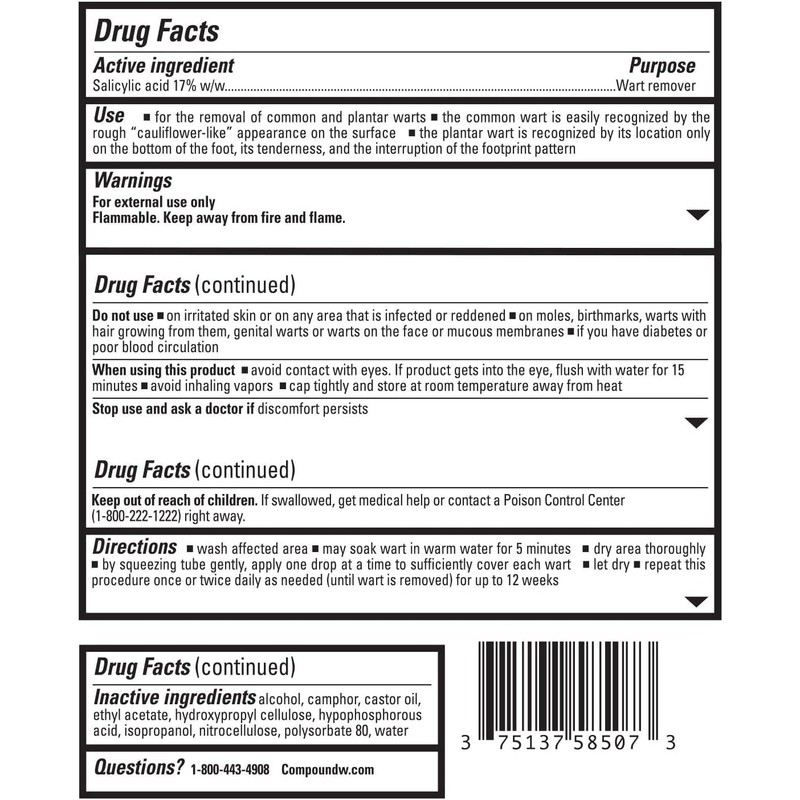 Easily remove stubborn common and plantar warts with this simple and effective, no-drip formula. Contains Salicylic acid, a trusted active ingredient in wart removal. From gels and liquids to freezing methods, there's a Compound W product that's just right for you. Each wart removal type easily and effectively removes warts. The Freeze wart removal method freezes the wart to kill the virus and can remove warts in as few as one treatment. Medicated bandages and topical liquids and gels slowly soften and peel away the wart over time with salicylic acid. While Freeze wart treatments can remove warts relatively quickly, medicated bandages and topical gels and liquids can take up to several weeks to fully remove a wart. Compound W also has special wart remover products specially designed for kids with two removal types โ freeze and medicated bandages. Compound W offers a variety of wart treatment products so you can treat warts at home and get back to looking and feeling great.