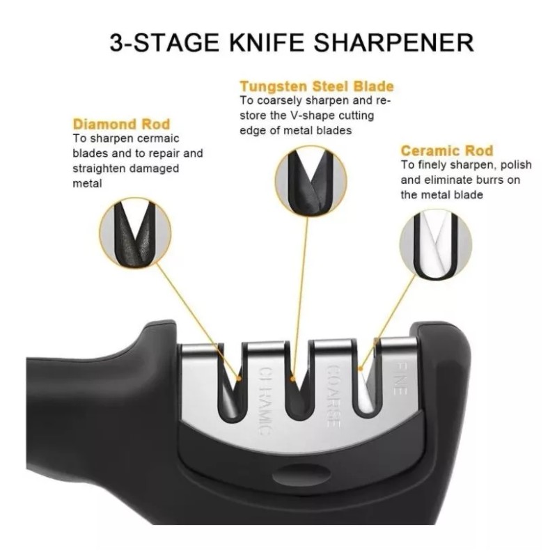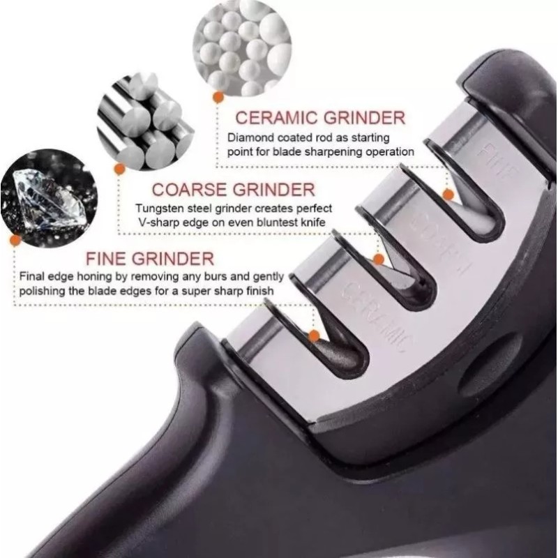 AFILADOR DE CUCHILLOS DE 3 ETAPAS - ¡Con nuestro increíble sistema de 3 ranuras, estamos revolucionando el arte de afilar cuchillos! La primera varilla de afilado de diamante repara y endereza las cuchillas dañadas antes de que la segunda ranura afile para restaurar su forma de V. Finalmente, la tercera ranura afina las melodías para un pulido limpio.