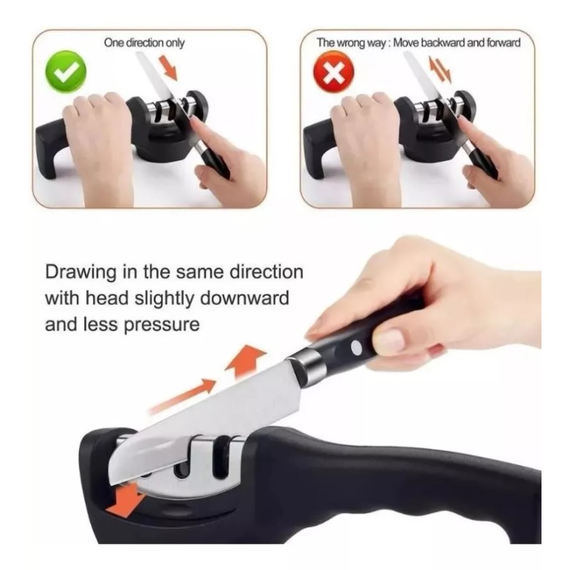 FÁCIL DE USAR - Si eres diestro o zurdo, el mango ergonómico te permite restaurar tus cuchillos de cocina en cuestión de segundos. Simplemente coloque la hoja en cada una de las ranuras y tire suavemente del cuchillo unas cuantas veces para un afilado rápido y efectivo.
