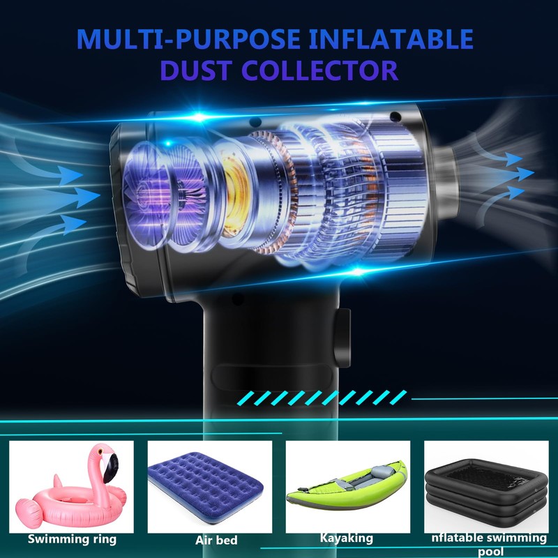 • POWERFUL CURRENT: Suction and blowing 2-in-1 compressed air dust collector - the motor speed is up to 51,000RPM, 3 different air speeds can be switched by the button, it can blow strong air with 52g-150g pressure, and at the same time, it has a vacuum suction power of 5,500pa, which is designed to clean different equipments, so that there is no place to hide from the dust, and you can say goodbye to the trouble of dust and debris.