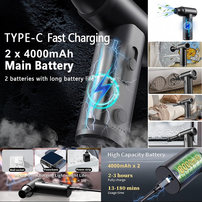 - 【Long Battery Life & Fast USB-C Charging】Ensuring extended use and quick recharging. Its 8000mAh rechargeable battery provides up to 180 minutes of operation at low speed and 13 minutes at high speed, allowing for prolonged and uninterrupted cleaning sessions. The inclusion of a Type-C charging interface ensures fast and convenient recharging, so you can quickly get back to your tasks. This combination of long battery life and efficient charging makes the MTJ-Pro a reliable and convenient tool for various applications.