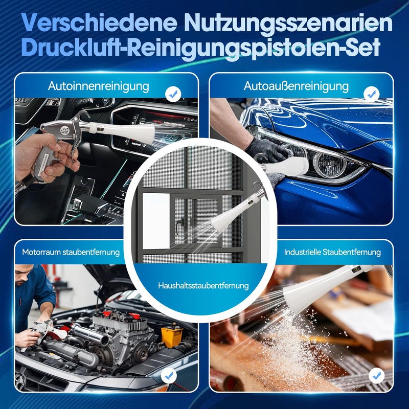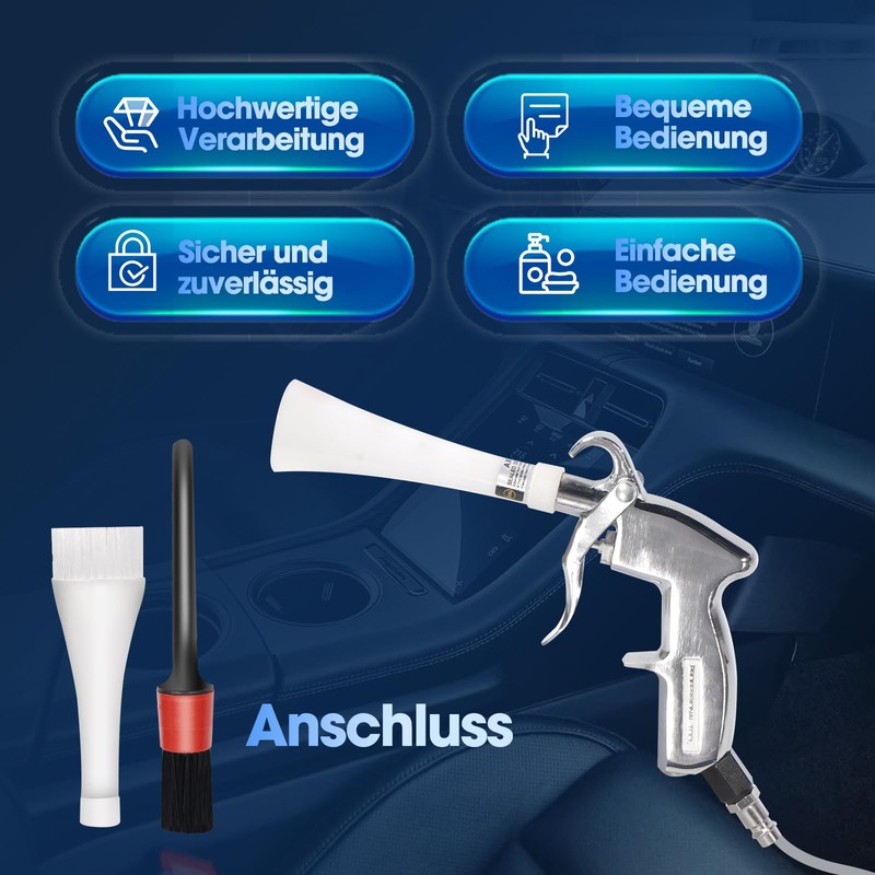 • High-quality car cleaning gun: aluminium alloy cylinder and nozzle, efficient dust remover for interior and exterior cleaning of surfaces and details. Aircraft-grade aluminium housing + copper core valve, high pressure and corrosion resistance, exceptional quality - a real eye-catcher. C hook for easy installation.