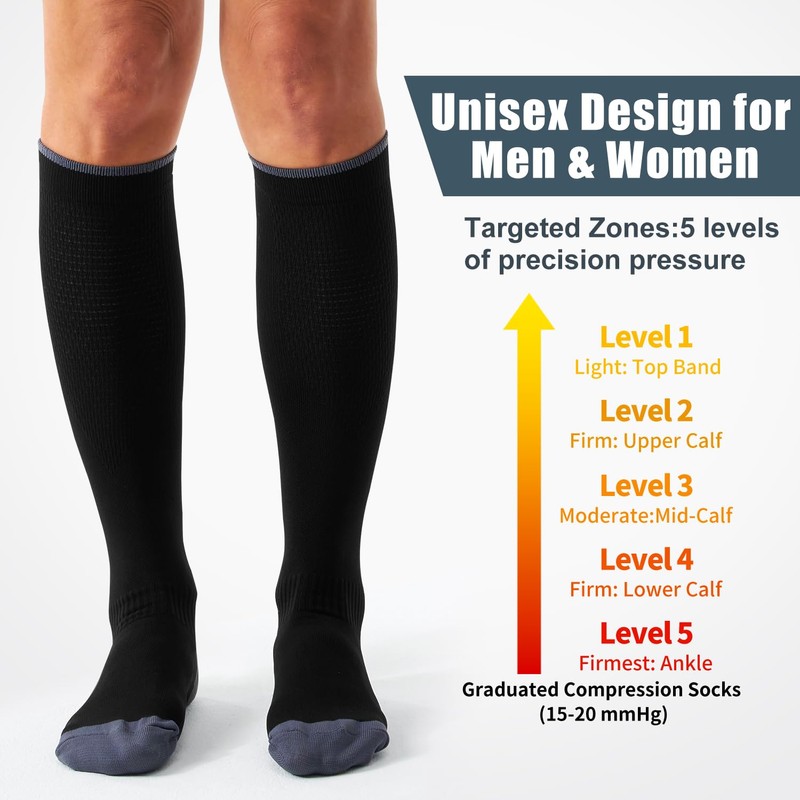 - [Targeted Graduated Compression]:Featuring five-zone graduated compression (15-20 mmHg),Our compression socks optimize venous flow, support the plantar fascia and Achilles tendon, and minimize swelling.They relieve shin splints,joint stiffness,and muscle fatigue while promoting faster recovery and preventing blood pooling.Designed for daily wear,they offer comfortable,effective support for active lifestyles or those seeking relief from varicose veins.