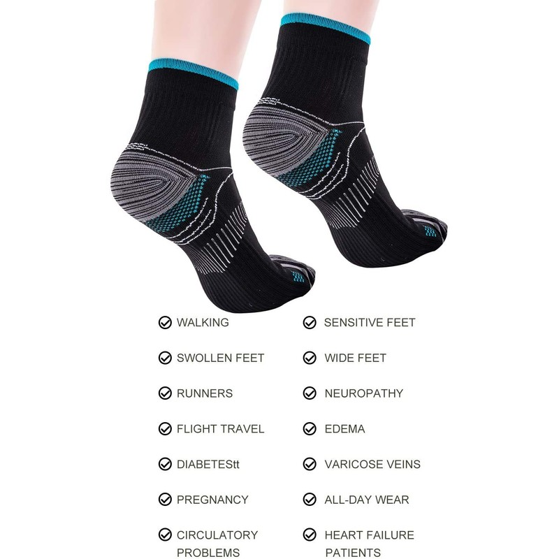 - Compression is proven to improve blood flow, move faster, react quicker and use less energy,Circulation support to fight fatigue,Relief from pain due to plantar fasciitis and foot injuries,Assistance with recovery after exercise.