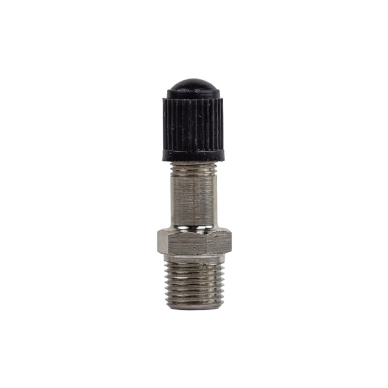 1/8" Male NPT Schrader valve. This is a high quality, USA made, Schrader valve. This valve features 1/8" male NPT threads for installation and comes with a plastic end cap for protecting the filling end. This is commonly used in compressed air and water systems but can be used in countless applications. This valve measures approximately 1-3/8". Specifications: 1/8" Male NPT Threads (Measure 3/8" Diameter) Valve Length Approximately 1-3/8" Made In The USA