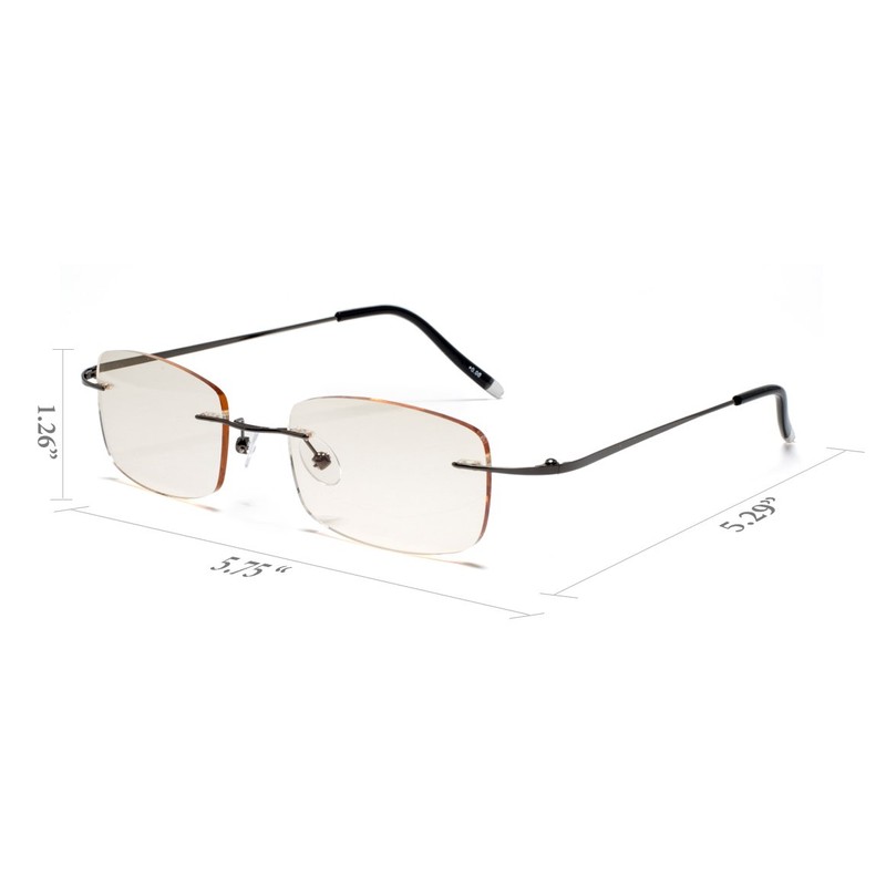 **Almost Invisible Computer Glasses** Whether you’re using a computer, tablet or enjoying a book, FLORIDA GLASSES helps you avoid eye strain caused by harmful blue light and regain clarity. These computer reading glasses are suitable for men or women. Quality stainless steel frame, which qualities include: super light weight; nickel- free and thus hypoallergenic, excellent resistance to corrosion, abrasion and heat. These glasses also feature aspheric lens. Advanced optical design technology allows aspheric lenses to be made with flatter curves than conventional lenses, giving them a slimmer, more attractive profile. These glasses have permanently attached screws and measure 5 1/2" across , lens height 1 1/4” , temple length 5 5/16". Temples are very flexible, so they fit practically any face size. We guarantee 100% satisfaction on our rimless glasses. These computer reading glasses protect from CVS (COMPUTER VISION SYNDROME) by filtering high energy light waves and decreasing reflective glare and also improves visual sharpness. The symptoms are: blurred vision, headache, burning and tired eyes, neck and shoulder pain, etc. These computer glasses feature an anti-reflective coating lenses and are tinted for filtering the harmful light waves. FLORIDA GLASSES products are accompanied by a branded microfiber dust cloth bag. Available powers: 0.00 +0.50 +1.00 +1.25 +1.50 +1.75 +2.00 +2.25 +2.50 +2.75 +3.00 **100% satisfaction guaranteed!**