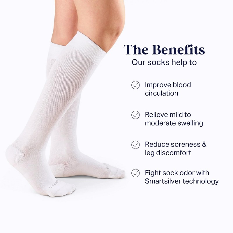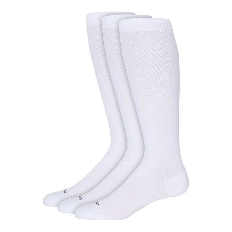 - All-Day Support: With 15-20 mmHg of True Graduated Compression, Comrad Nylon Knee-High Compression Socks offer all-day comfort. These compression socks for men and women promote circulation and help prevent sock odor with SmartSilver technology. Pack of 3 in White. 91% Nylon / 9% Spandex.