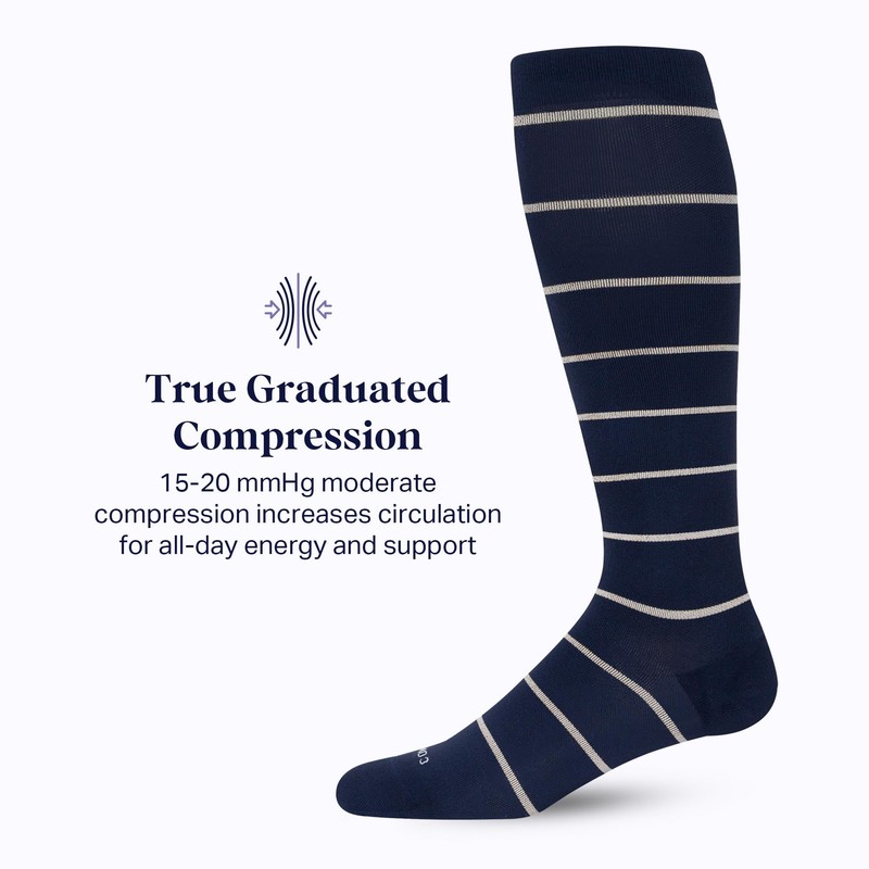 • All-Day Support: With 15-20 mmHg of True Graduated Compression, Comrad Nylon Knee-High Compression Socks offer all-day comfort. These compression socks for men and women promote circulation and help prevent sock odor with SmartSilver technology. Navy/Sand Stripe. 91% Nylon / 9% Spandex.