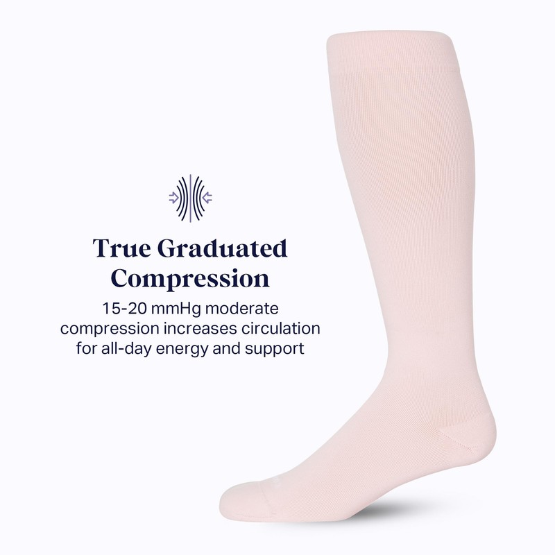 - All-Day Support: With 15-20 mmHg of True Graduated Compression, Comrad Nylon Knee-High Compression Socks offer all-day comfort. These compression socks for men and women promote circulation and help prevent sock odor with SmartSilver technology. Rose solid. 91% Nylon / 9% Spandex.