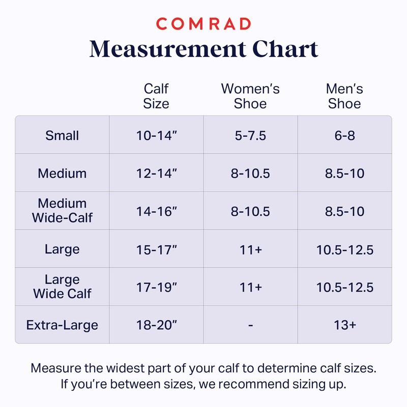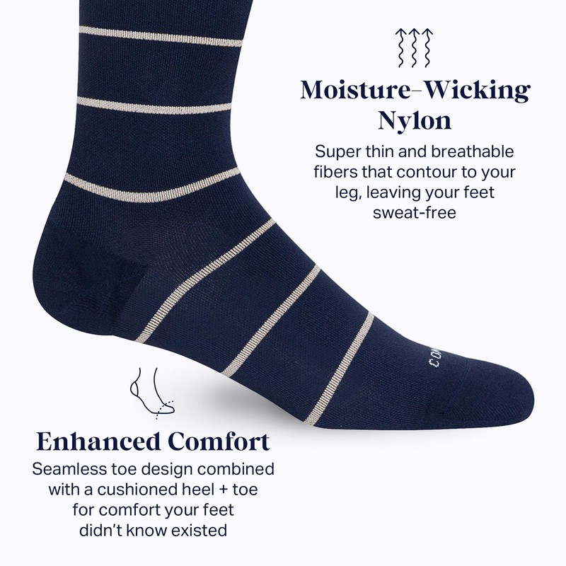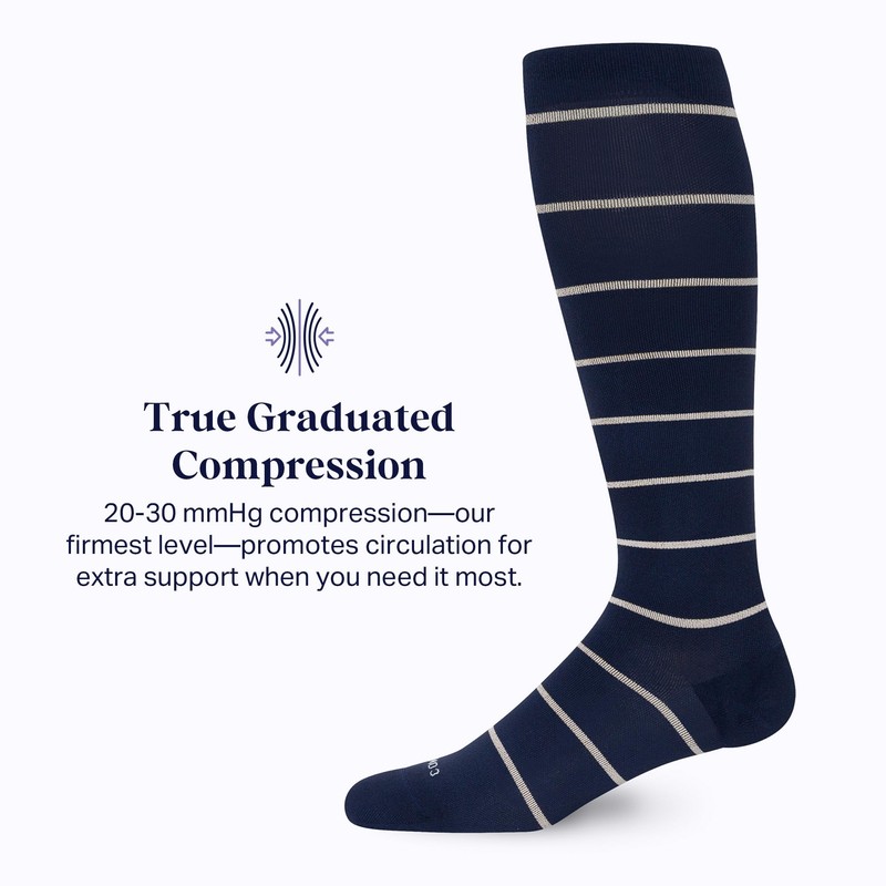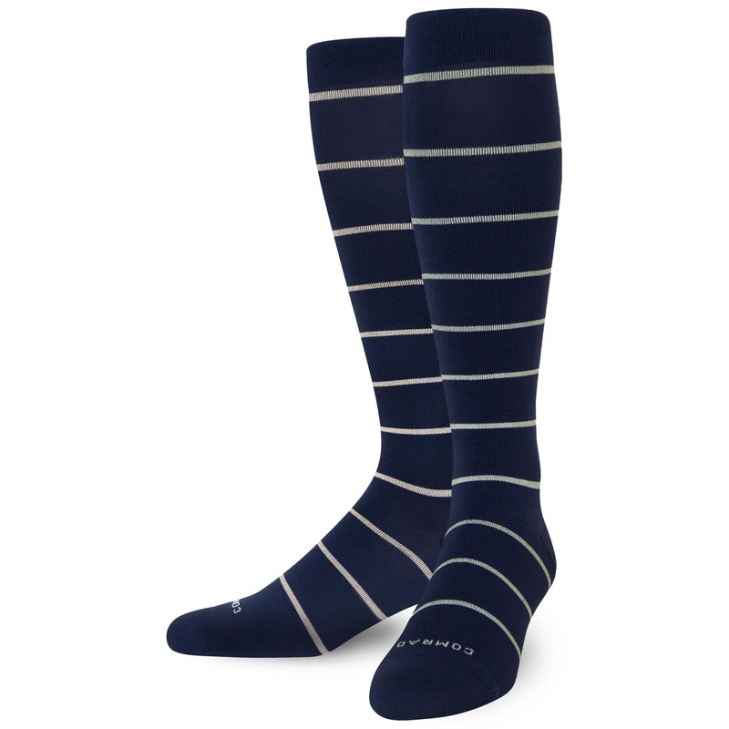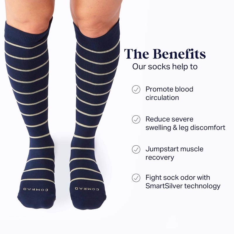- Our Firmest Level of Support: With 20-30mmHg of True Graduated Compression, Comrad Nylon Knee-High Firm Compression Socks offer a super snug fit and 24-hour support. These medical grade compression socks for men and women increase circulation, enhance muscle recovery, and help prevent sock odor with SmartSilver technology. Navy/Sand Stripe. 91% Nylon / 9% Spandex.