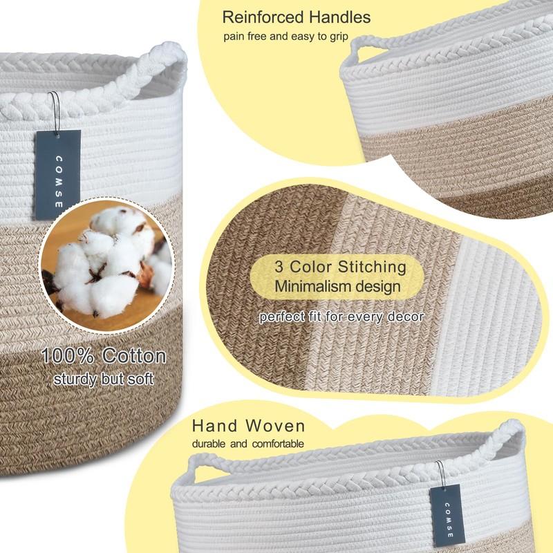- 【Large Size】21.7" x 13.8", large blanket basket which is perfect for throw pillows, blankets, toys, clothes, Comforter or Cushions. Whether it is helping your child develop clean living habits, or as a decorative basket for your friends. With the appearance and practicality, we believe COMSE cotton storage basket is perfect as a gift for Birthdays, Festival.