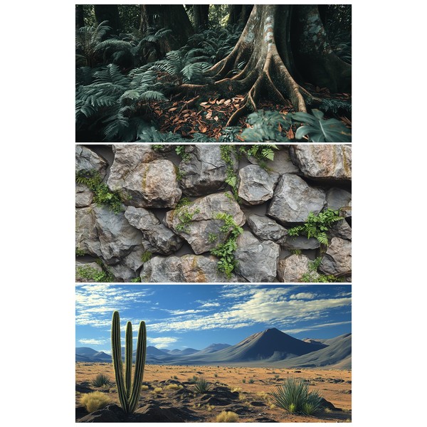 COMSUN 3 Pack Terrarium Background, 30x18 inches Polyester Reptile Background, Cloth Terrarium Background, Tropical Green Tree Fern & Gobi Desert Sunshine Cactus Rock Terrarium Background