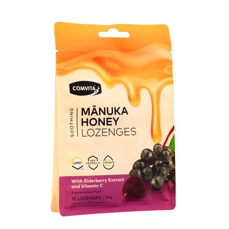 Comvita Soothing Manuka Honey Lozenges - Elderberry (with Vitamin C and Bee Propolis), 12 Lozenges