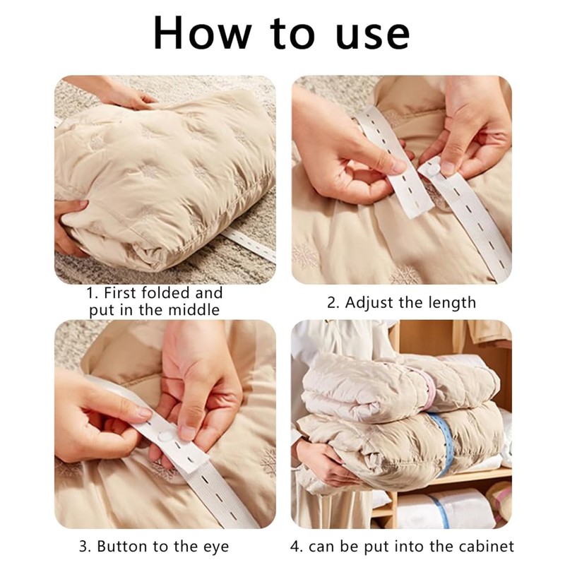 • INSTRUCTIONS FOR USE : 1. Fold the clothes that need to be stored to fit the size 2. Put the clothes neatly on the elastic belt 3. Adjust the width of the elastic band and tighten it 4. Tighten the storage straps and adjust the buttons to the buttonholes.