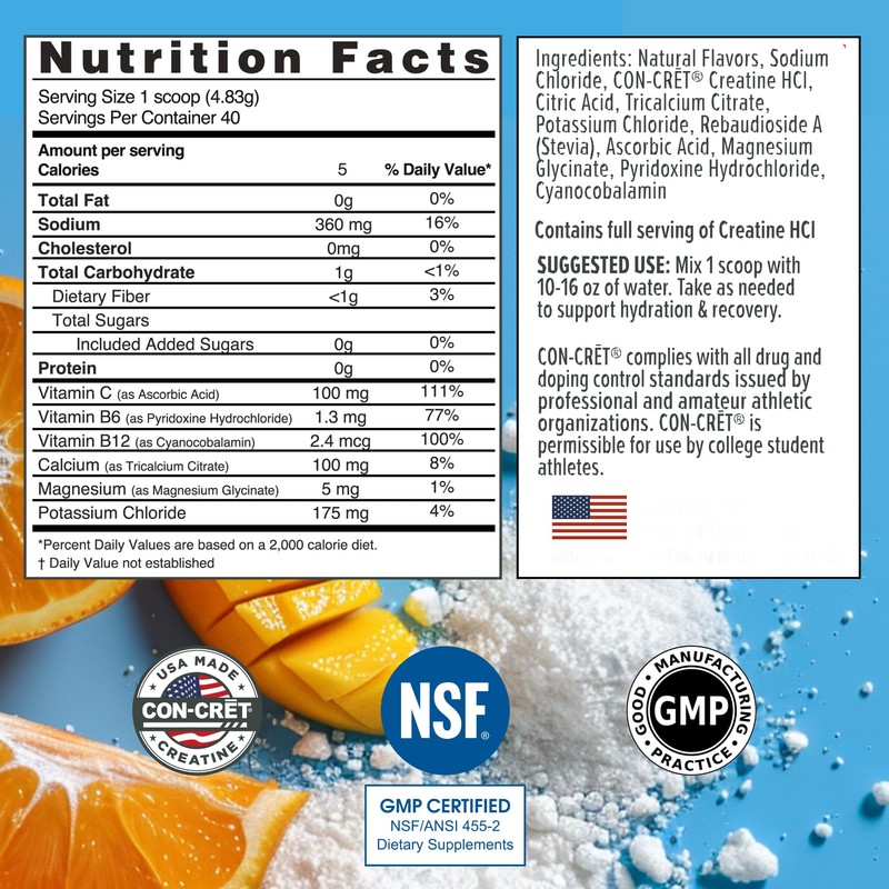CON-CRET Creatine HCl + Hydration | Electrolyte Powder Tub | Citrus Mango | Sugar Free Electrolytes | Rehydration Formula w Potassium, Sodium, Zinc, Magnesium to Hydrate & Recover (40 serv)