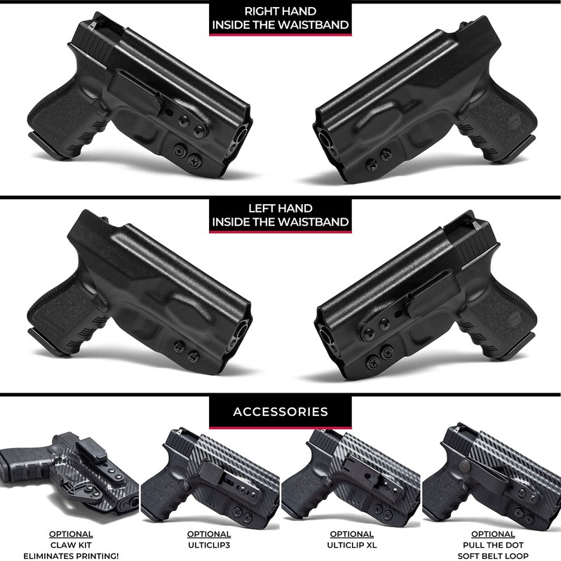 • OPTIONAL ACCESSORIES - CLAW COMPATIBLE: Our Springfield Hellcat Tuckable IWB Holster is now Claw Compatible. Our optional Claw Kit cleverly eliminates printing forever by utilizing your belt to angle the butt of your weapon in towards your body. This effectively makes your weapon disappear inside your belt line. Our Tuckable holsters are also compatible with the Ulticlip3 and/or Ulticlip XL, plus our Low Profile and PTD Soft Belt Loop Kits, making these the most versatile IWB Holsters available.