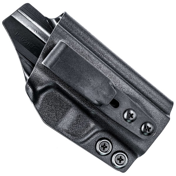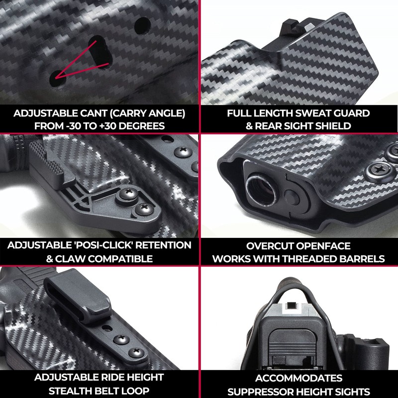 • EXCLUSIVE HOLSTER FEATURES: Undercut Trigger Guard keeps the KYDEX from interfering with your draw. Over-Cut Open-Face accommodates Threaded Barrels and clears Suppressor Height Sights. Full Length Sweat Guard & Rear Sight Shield to protect your weapon from sweat. Fiber Reinforced Stealth Belt Clip, so no one knows you are carrying. We utilize all Black Oxide Steel (Phillips) hardware with Threadlock, so you can easily make adjustments but never lose a screw.
