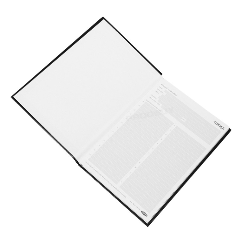 - Concept branded A5 A-Z index book with black cover and dark red colour text and detaling
