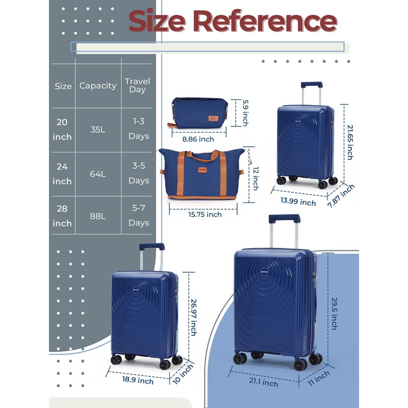 - 5 PIECE LUGGAGE SETS - The luggage sets of 5 pieces offers 20" carry on luggage,24" medium checked luggage,28" large check-in suitcase, an extended duffel bag, and a toiletry bag. Nestable for easy storage, the multi-functional suitcase set can meet all your travel needs.