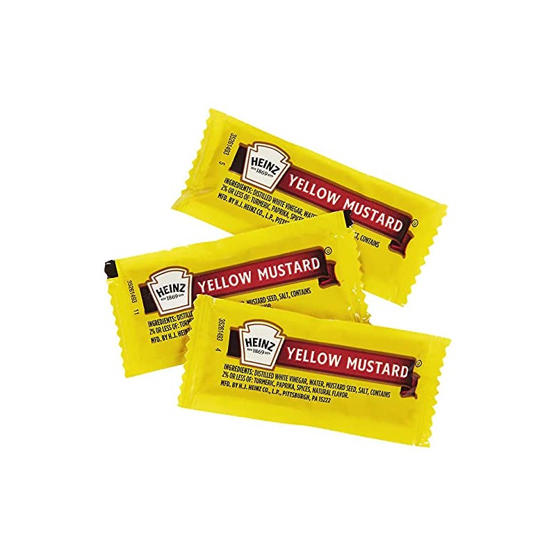 Package includes 100 packs of 9g Heinz Ketchup and 5.6g packets of Heinz Mustard. Great for packing lunches, picnics, catering , and bbq's