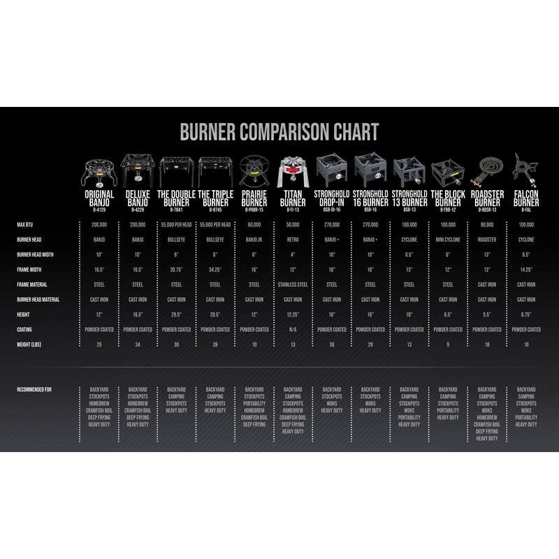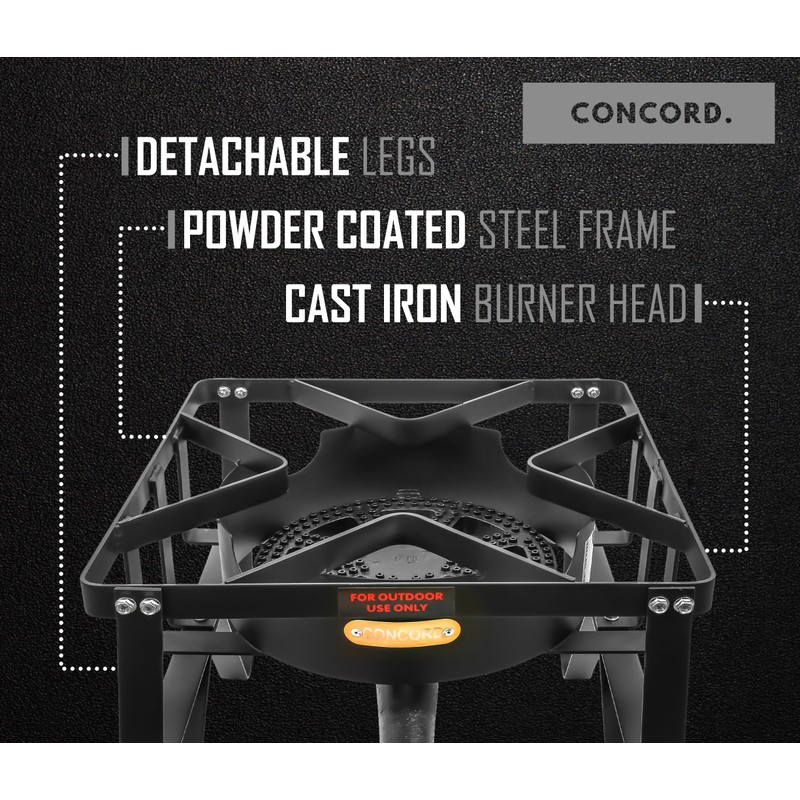 - Concord's Single Propane Banjo Burner is made with Heavy Duty Cast Iron with a powder coated high temp Weather Proof coating, Will last a Lifetime. Burner with stand Size: 16.5"x16.5"x16.5".