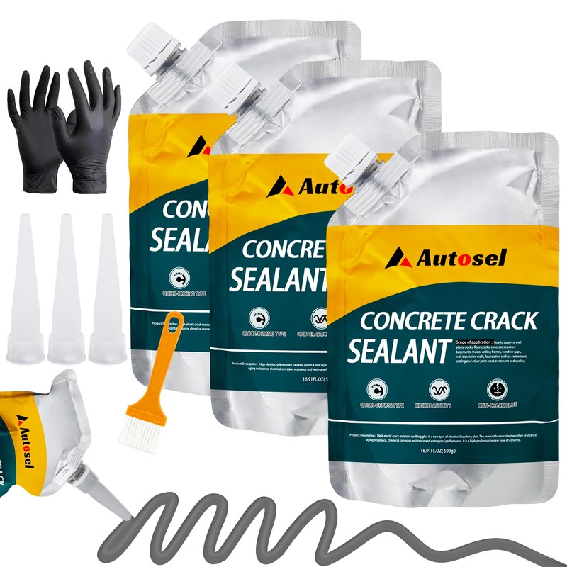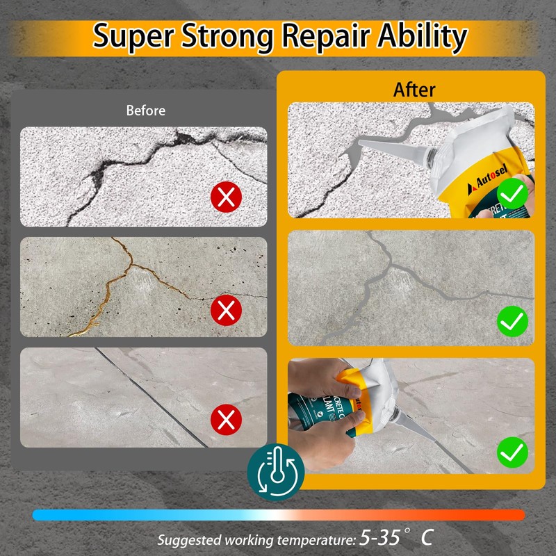 - 【Waterproof & Weatherproof Protection】Autosel crack filler for concrete creates a strong waterproof barrier that resists rain, snow, and extreme temperatures. Driveway cement crack filler prevents water infiltration, weed growth, and surface damage, making it ideal for outdoor concrete, asphalt, and driveway repairs