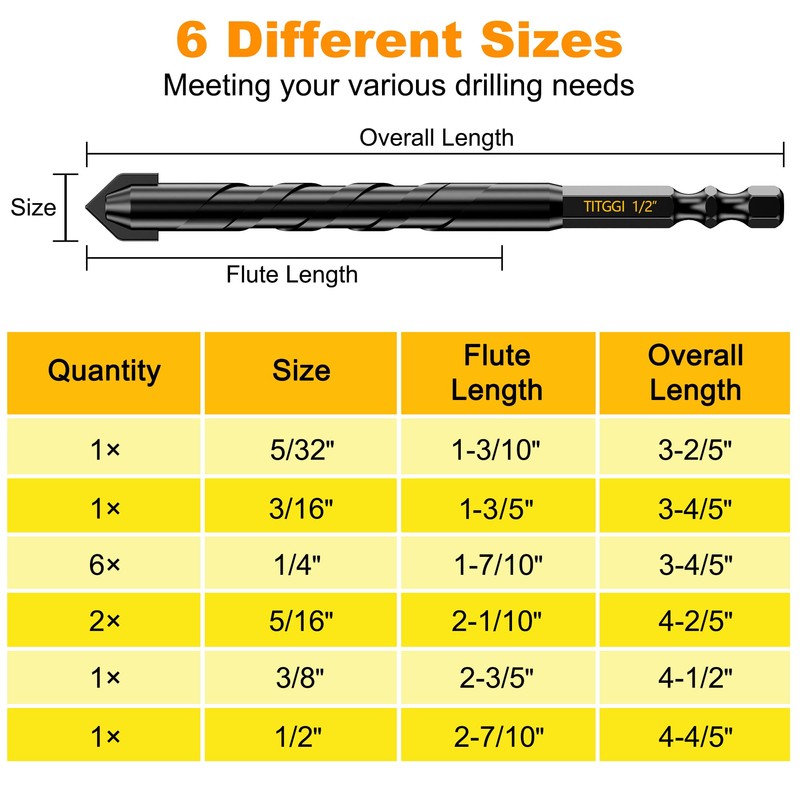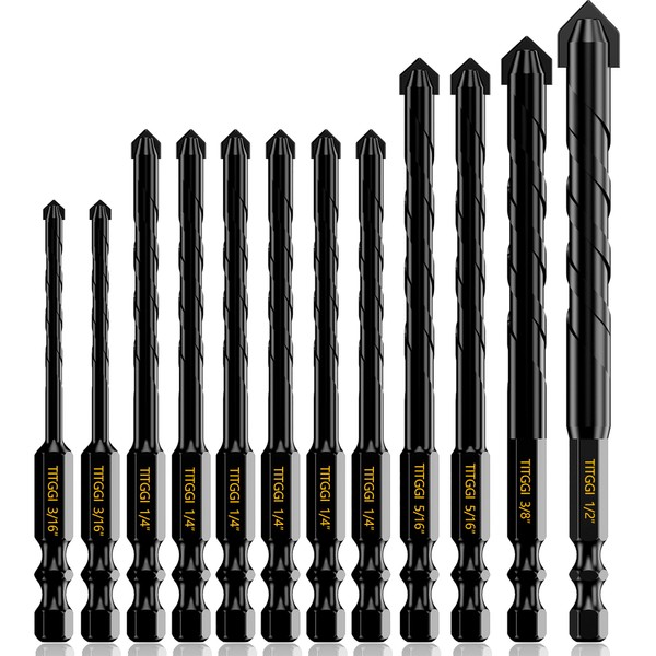 - HIGH QUALITY DRILL BIT SET; TITGGI concrete drill bit set, drill bit tip made of high-quality YG6X hard alloy, fully polished and rustproof, clean and sharp without burrs. This masonry drill bit can easily penetrate various material (glass, ceramic, cement, wood, brick, hard plastic, etc.)