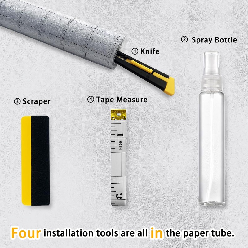 - Static Cling Window Film With Tools: The paper tube of the window film package contains the tools required for installation: knife, spray can, scraper, tape measure. Make your installation easier and more convenient.