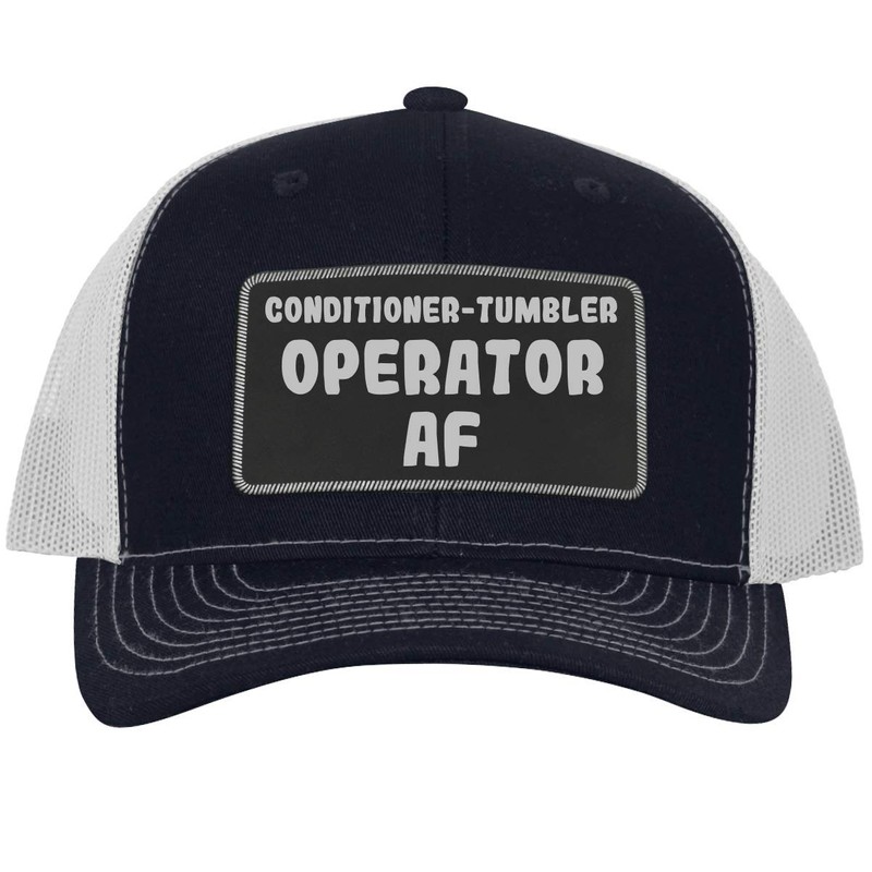 Conditioner-Tumbler Operator AF - Leather Black Patch Engraved Trucker Hat, Navy-White, One Size