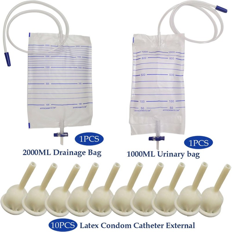 - Condom catheter external self sealing set: 10 pieces urinal condom for men + 10 adhesive tapes + 1 piece 1000 ml urine bag + 1 piece 2000 ml urine bag