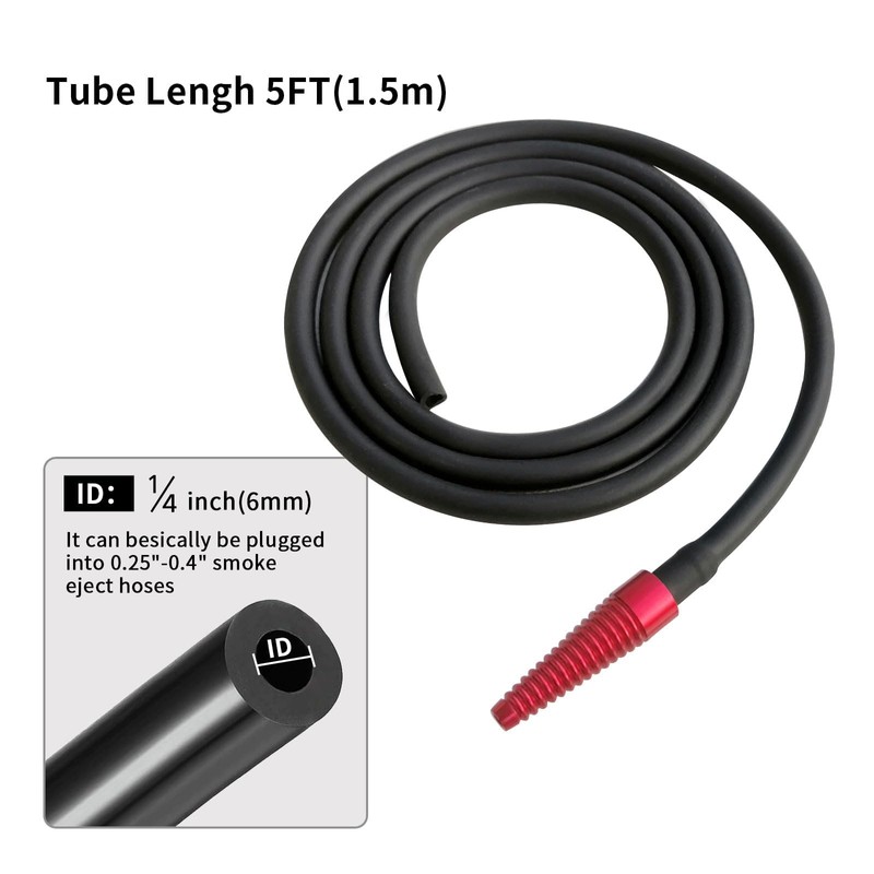 The barb(0.34”OD) end of this nozzle is already attached with a 59”/1.5m long elastic silicone rubber tube for you. And please note that the tube is a kind of elastic silicone,so it can basically be plugged into 0.25”- 0.4” smoke outlet holes. All you need to do is to make sure your smoke machine outlet hole is within 0.25”- 0.4".