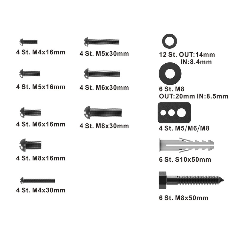 • Box contents: 4x M4x16, 4x M5x16, 4x M6x16, 4x M8x16, 4x M4x30, 4x M5x30, 4x M6x30, 4x M8x30, 6x wall plugs S10x50mm, 6x wall screws M8x50mm, 12x Ass. btandshal6 x washers, 4 x washers
