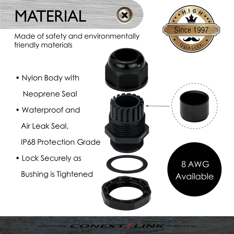 Conextlink 5pcs Waterproof IP68 Nylon Firewall Bushing Grommet Cable Gland Joint Adjustable Locknut Protectors for Power Cable Black 8 Gauge