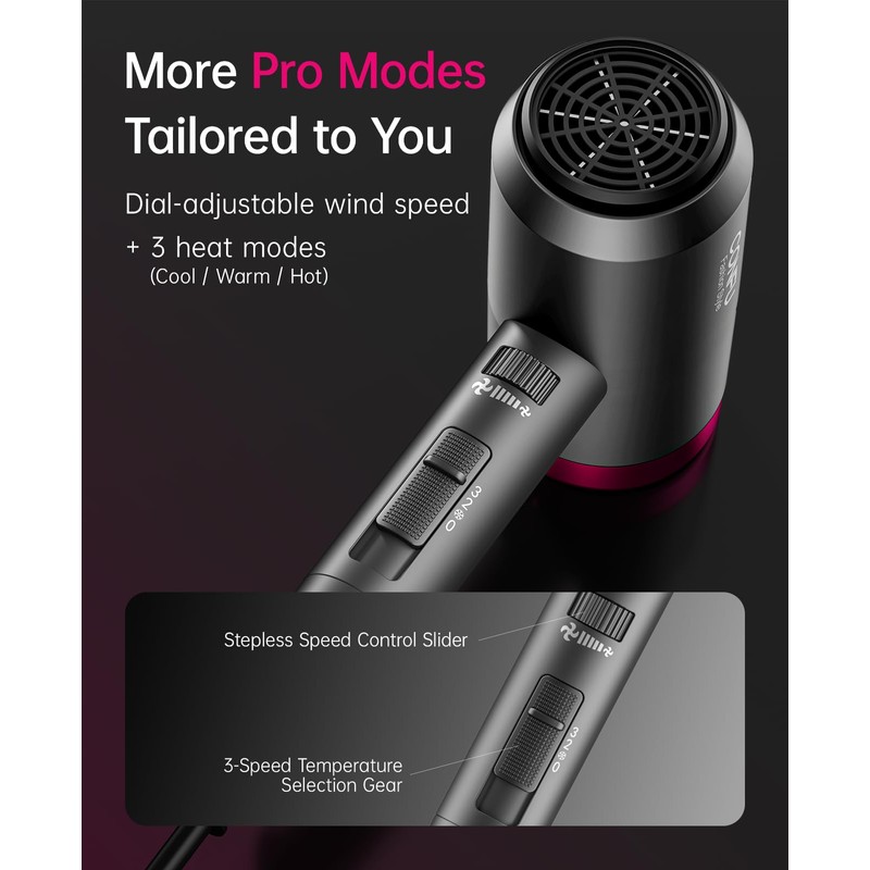 - đă3 Heat Settings & Stepless Speed ChangeăOur blow dryer has three temperature settings: cool /warm /hot, And there is a stepless speed adjustment button, which can adjust the wind speed arbitrarily, with infinite wind speed setting, easy to control the temperature and wind speed to make your favorite hairstyle at home.