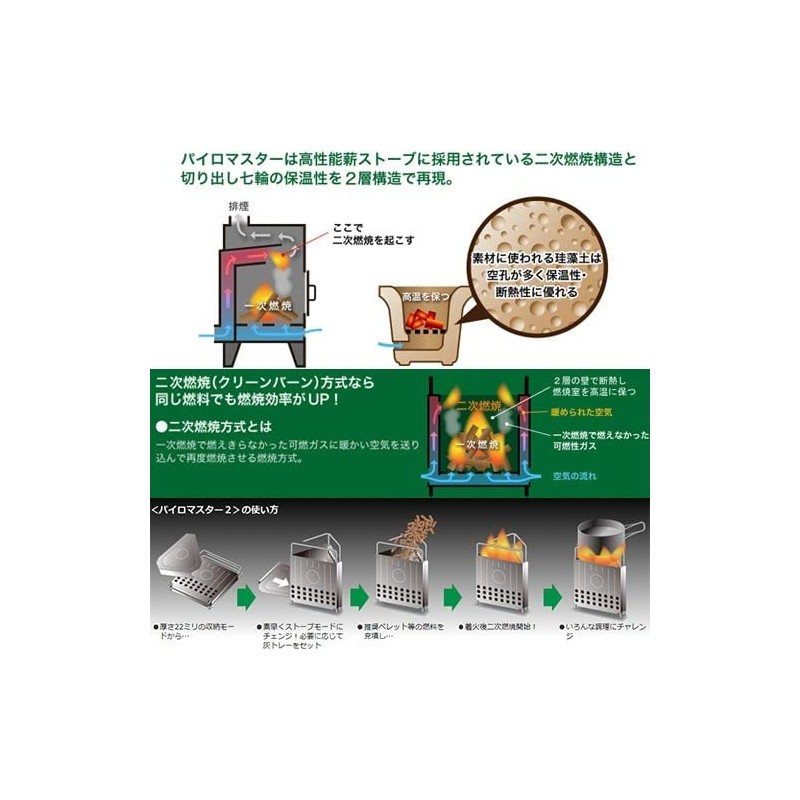 • The Pyro Master 2 is a compact folding type, yet has been reproduced with a secondary combustion structure that is used in high-performance wood stoves, and the heat retention of the cut out chamber. In order to make a compact yet sturdy item, the 4mm stainless steel frame combined with the trivet provides rigidity that can be used safely even with cast skillets and 2L kettles. Why double layer construction is better? Flammable gases are produced when the fuel is high temperature. This flammable gas will be ignited and "burning" (primary combustion), but with normal burning, flammable gas will not burn all the remaining gas will be emitted as smoke. It is said to send fresh air into this burned gas and re-burn it is a secondary combustion. It burns gas emitted as a smoke, so it consumes less smoke and fuel without waste