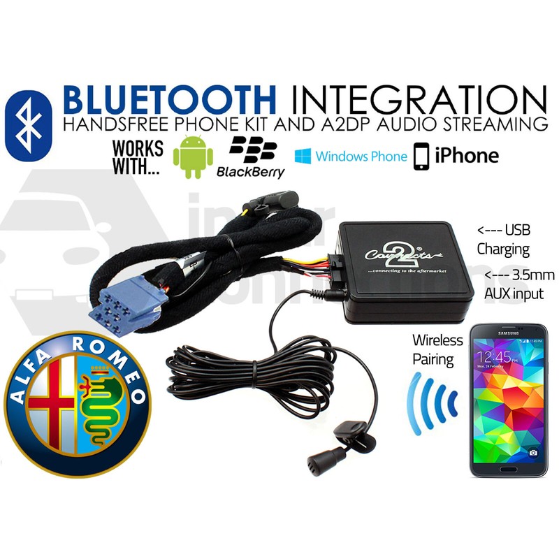 This Alfa Romeo 147 in car Bluetooth streaming interface is compatible with all popular smartphones and mobile devices including Android, Apple OS, Windows Mobile, Sony, HTC, Blackberry etc and (once installed) can be used immediately in your vehicle with no need to connect any cables unless charging is required.