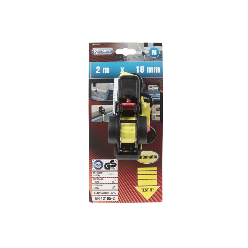 Connex DY270670 Lashing Strap – One Piece – 2 m x 18 mm – 100 kg Maximum Load Capacity – Automatic Retraction – With Tension Ratchet & S-Hook – Made of Polyester / Lashing Strap / Load Securing /